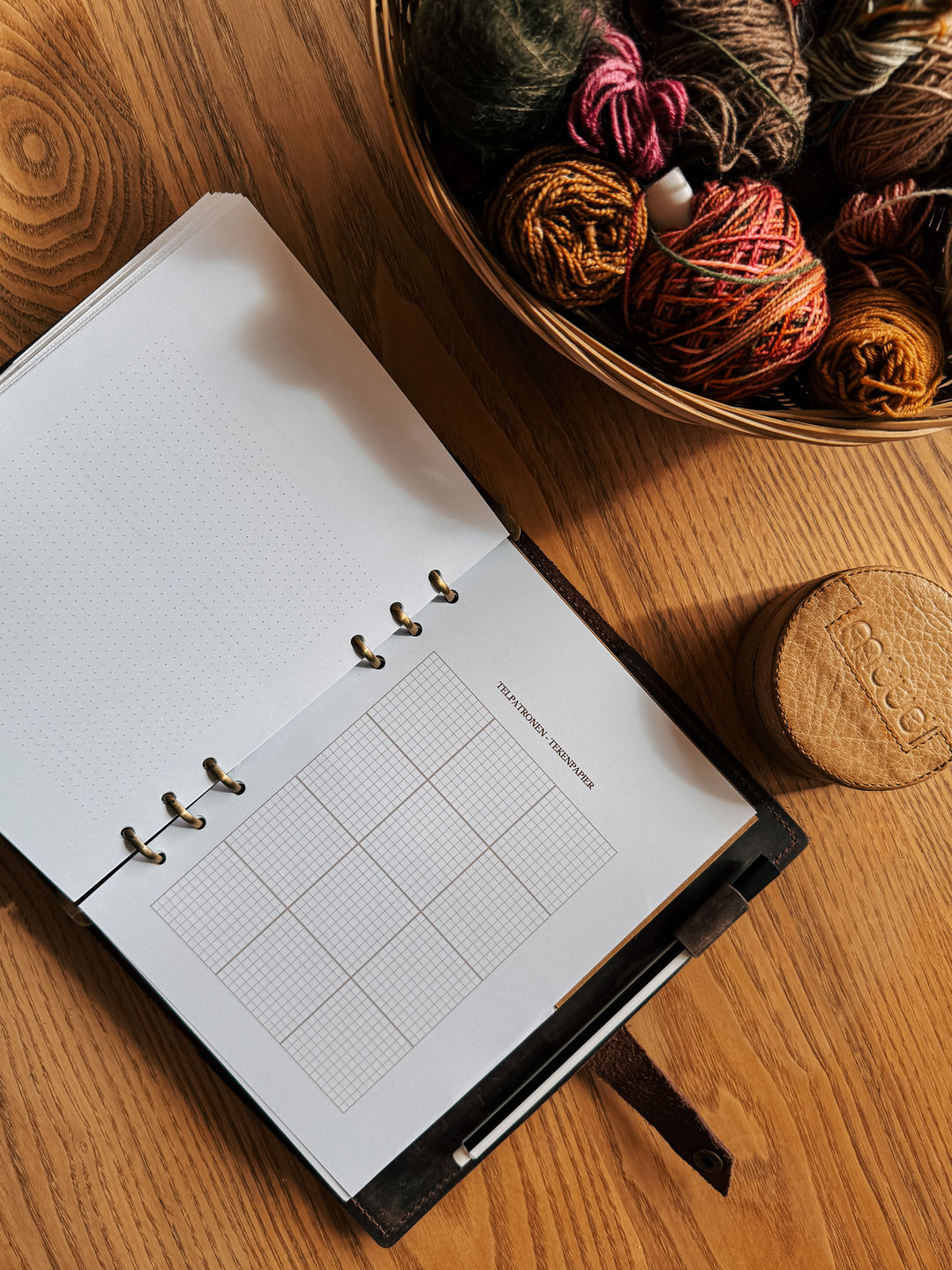 to fit journal kn.it. Pages will be suitable for a 6-rings holder. - It's great that you can make your journal completely to your taste. Do you want a brown leather multomap or a bright pink organizer to keep your pages in? It's all possible.